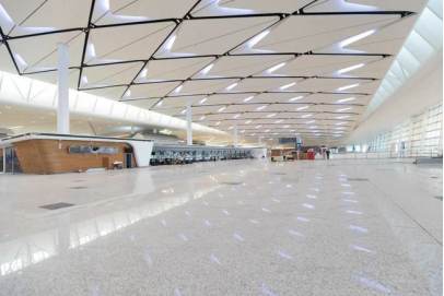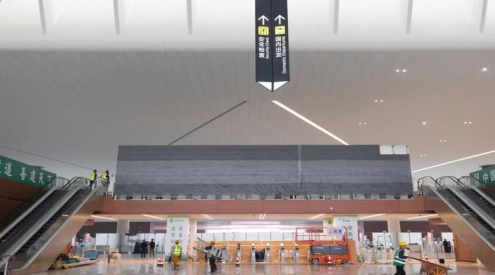 T1、T2航站樓總建筑面積71萬平方米,為國內首創“手拉手”結構造型。在滿足旅客吞吐量的前提下,這樣的設計,可減少旅客從安檢到登機口的直線距離。這也使得天府國際機場成為全國首個一次性建設兩座航站樓的機場。