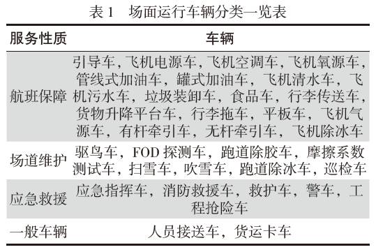為保障航班運(yùn)行,飛行區(qū)內(nèi)存在不同類型作業(yè)車輛,大致可分為4 類(如表1 所示),這4 類車輛有著不同的運(yùn)行模式。