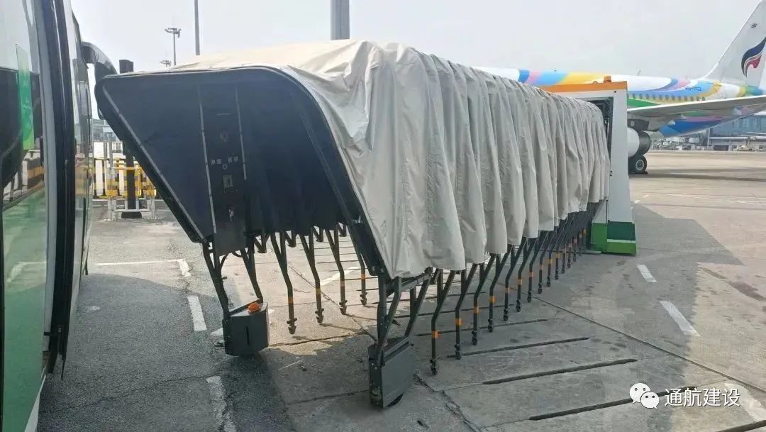 移動廊道寬2.48米,高2.43米,收攏狀態下僅占地5.2米,頂上帶有雨棚,由操作員從設備固定端向兩端操作可移動通道和雨蓬,一端連接擺渡車門,另一端連接客梯車,完成臨時通道搭建。下了擺渡車,旅客穿過30米的廊道,就可以直接上客梯車登機。移動廊道的運用,不僅大力提升了白云地勤服務品質,更有效解決了遠機位機坪秩序維護和風險管控。