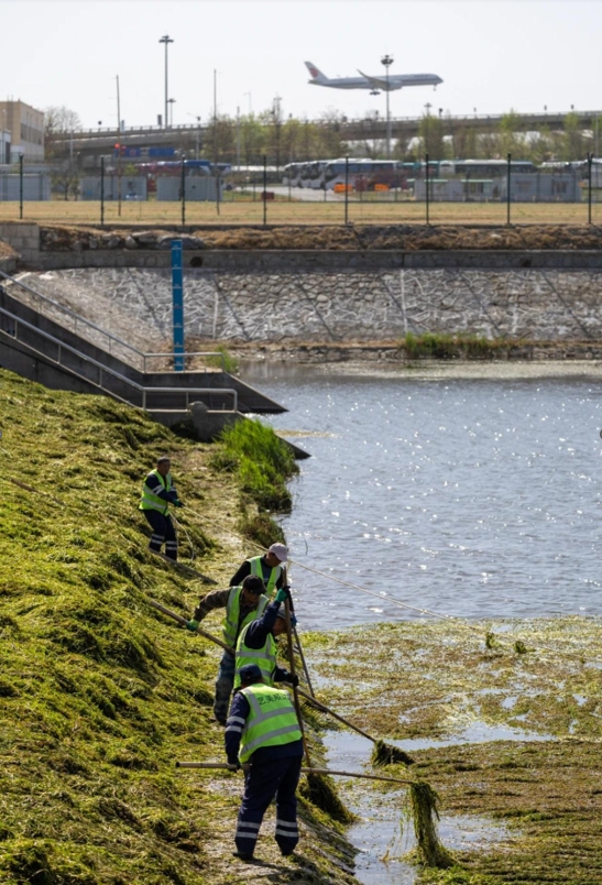 工作人員正在對飛行區(qū)蓄水池內(nèi)的水草及藻類進行清理。