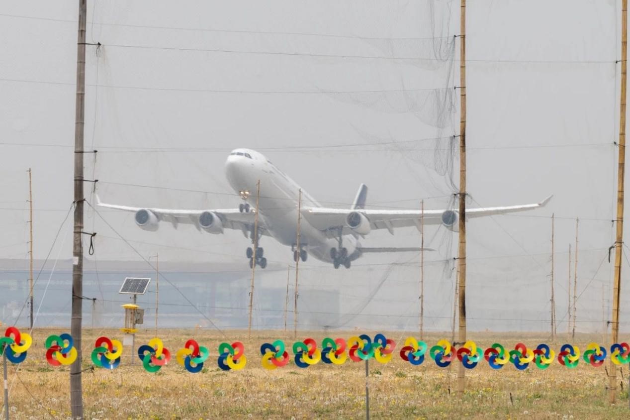 首都機場跑道周邊有物理攔鳥網(wǎng)和利用視覺驅(qū)鳥的彩色風輪。