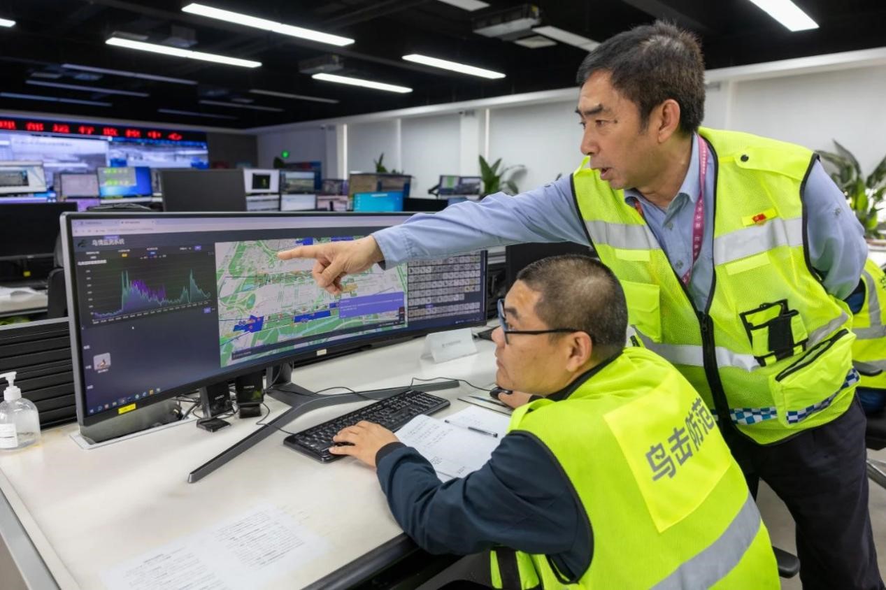 資深技師隋國輝(右)和鳥情監(jiān)控席值班員張波正在分析鳥情數(shù)據(jù)。