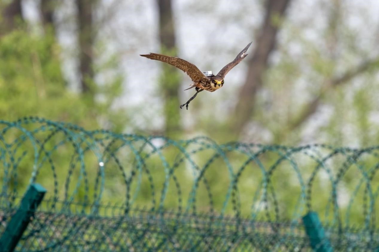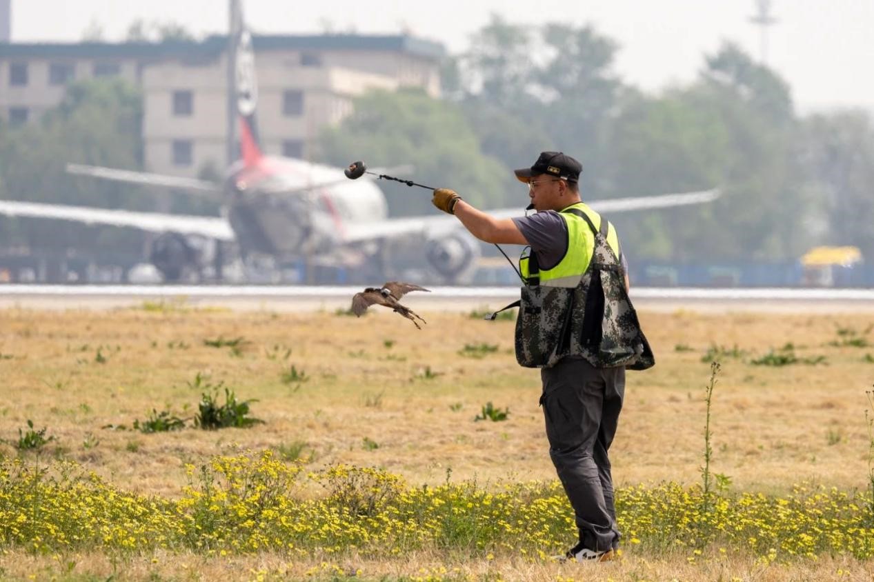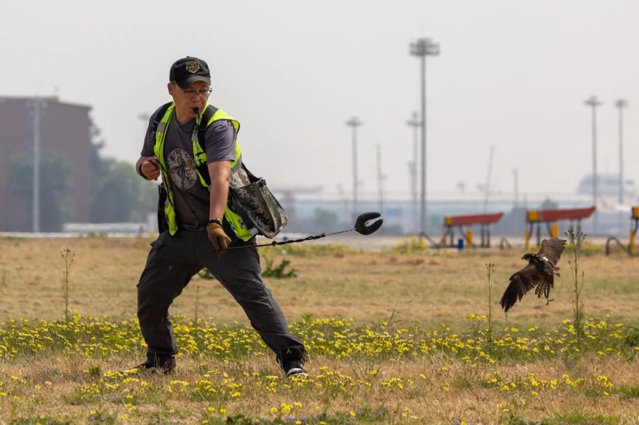 在做好生態(tài)治理的同時,首都機場于2018年在國內(nèi)率先使用訓練有素的獵鷹對機場上空的鳥類進行驅(qū)趕。此舉旨在利用位于食物鏈頂層的猛禽,給其它鳥類的覓食、棲息等行為帶來有規(guī)律的、持續(xù)的壓力,迫使其遠離機場。目前,首都機場用于驅(qū)鳥的猛禽主要分為驅(qū)趕型和狩獵型。栗翅鷹和獵隼盤飛能力強,主要負責驅(qū)趕鳥群。蒼鷹和雀鷹速度快,主要利用其捕獵能力強的天性驅(qū)鳥。首都機場根據(jù)每年不同時期鳥情的變化調(diào)整鷹的種類,以確保有效驅(qū)鳥。