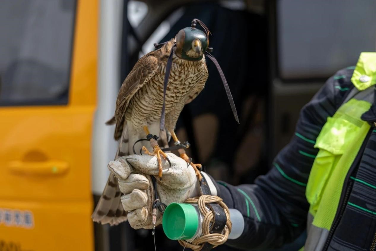 獵鷹進行低空盤旋驅(qū)鳥,其背部裝有用于定位的gps裝置。