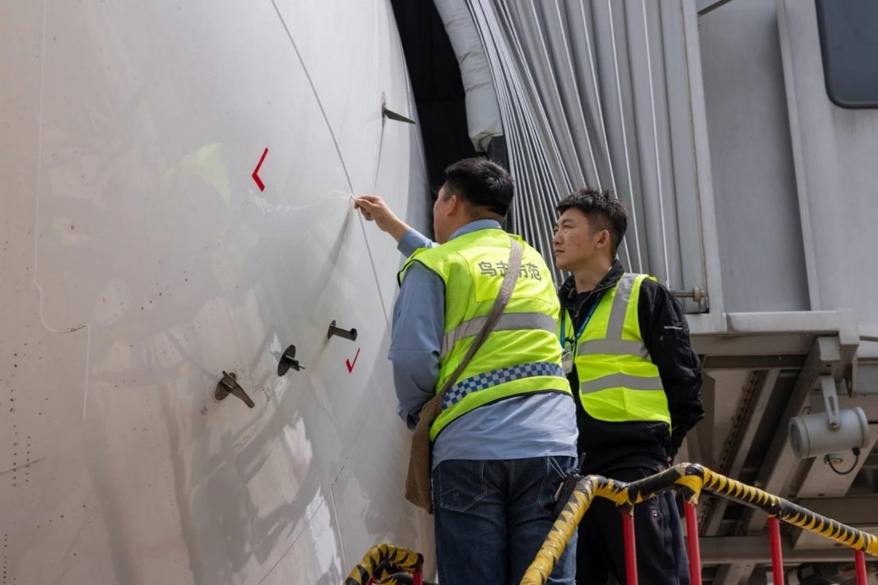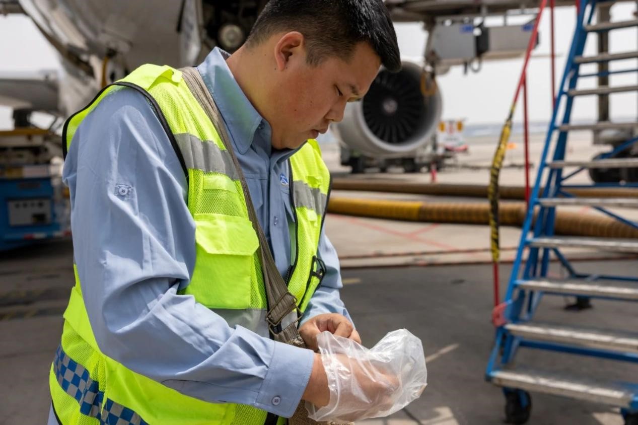 驅(qū)鳥保障員邵春國正在現(xiàn)場進行鳥擊事件調(diào)查取樣。