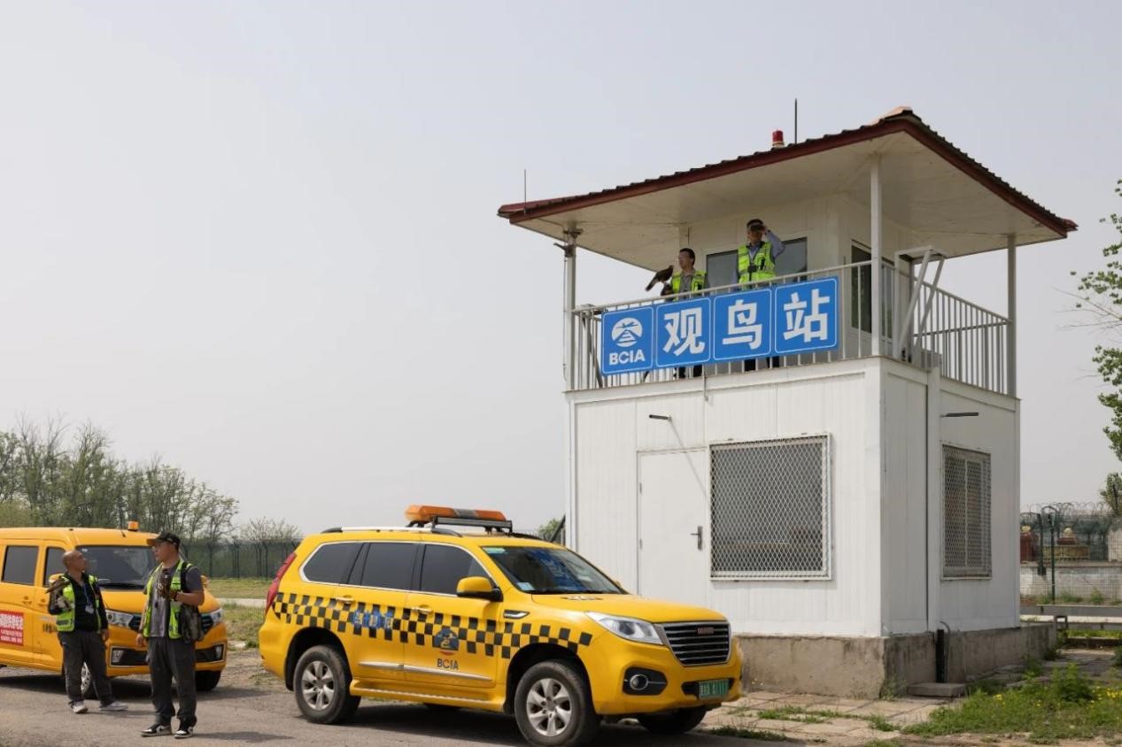 在首都機場飛行區(qū)的觀鳥站上,工作人員使用望遠鏡查看機場附近鳥類動向。